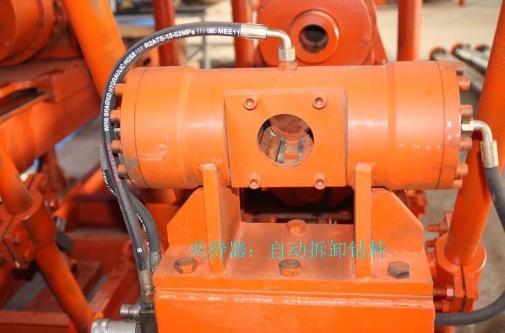 旋轉(zhuǎn)系統(tǒng)、夾緊系統(tǒng)、推進(jìn)系統(tǒng)全部液壓控制,自動上、卸鉆桿,減輕了操作工人的勞動強(qiáng)度。夾緊卡盤、變速箱系統(tǒng)一體化設(shè)計,夾緊油缸外置,卡緊力大,便于拆裝維修。推進(jìn)油缸采用雙出頭油缸設(shè)計,具有推進(jìn)行程長的特點,推進(jìn)行程可達(dá)到880mm。液壓系統(tǒng)采用雙泵供油回路系統(tǒng),推進(jìn)、旋轉(zhuǎn)互不影響。油泵、馬達(dá)、操作閥等核心部件均采用可靠廠家。鉆孔傾角在 ±90°范圍內(nèi)可調(diào),鉆孔300米完全沒問題。