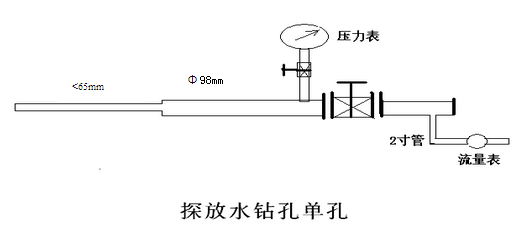 根據防治水相關規(guī)定,煤層探放水的止水套管長度選為10米。開孔采用φ42鉆桿,φ108金剛石鉆頭鉆進,鉆進10.0m后,沖洗鉆孔,下入φ98套管,套管長度6m,套管外口焊接法蘭盤,套管用水泥漿固定,掃出管內水泥后,法蘭盤外鏈接裝壓力表的短節(jié),短節(jié)外接高壓閘閥,然后換用不大于φ65鉆頭鉆進終孔。