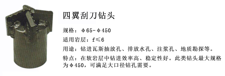金剛石復合片四翼鉆頭穩(wěn)定性好、適應性強、使用壽命長、鉆進中鉆整體巖層效率高、保徑效果好、適用范圍和具有優(yōu)越的性價比等特點,可廣泛應用于地質勘探、煤礦開采、水利水電施工、公路鐵路施工建設的巖石鉆進,鉆進瓦斯抽放孔、排放水孔、注漿孔、地質勘探等。